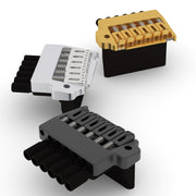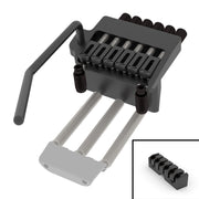 The same super smooth pivot pin design found on our US Contour and Flat Plate Tremolos is now available for your next headless build! The Headless Tremolo Bridge also features our proprietary split level design which offers the benefits of concealing the tuning assembly below the bridge plate, providing you with accurate and satisfying tuning action, and adding more down pressure to the saddle for improved tone and sustain.